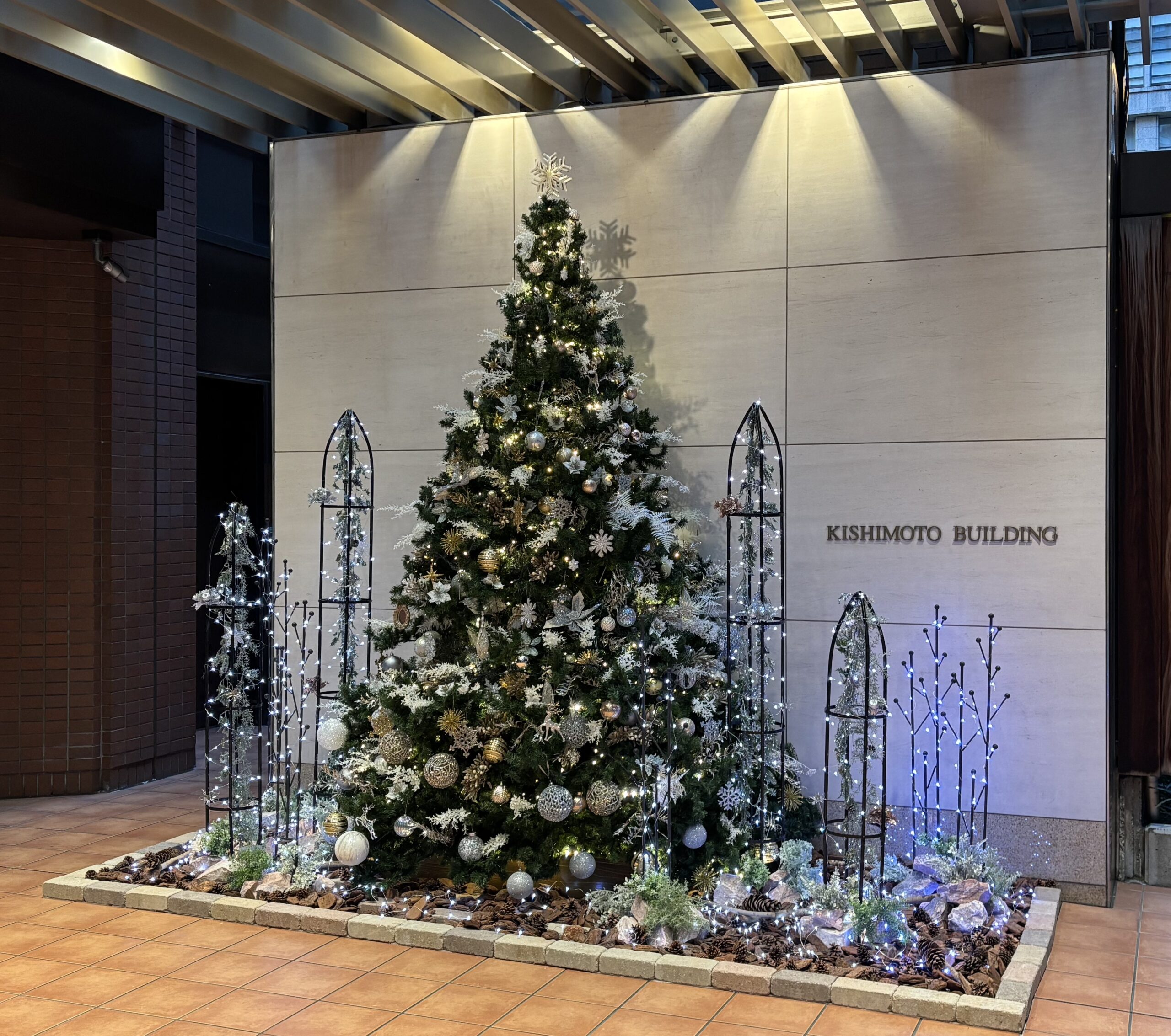 投稿日: 2025年12月1日2026年1月9日2025年 クリスマスツリーを設置しました。 毎年恒例のクリスマスツリーを玄関前に設置しました。 今年はビルの全館防災訓練が少し遅くなり、設置すると訓練に影響がある為、 クリスマスツリーの設置も少し遅れてしまいました。 オベリスク等を使用してロックガーデン風に装飾を行いました。 ツリーのトップに当たるように天井面にも照明を追加しました。